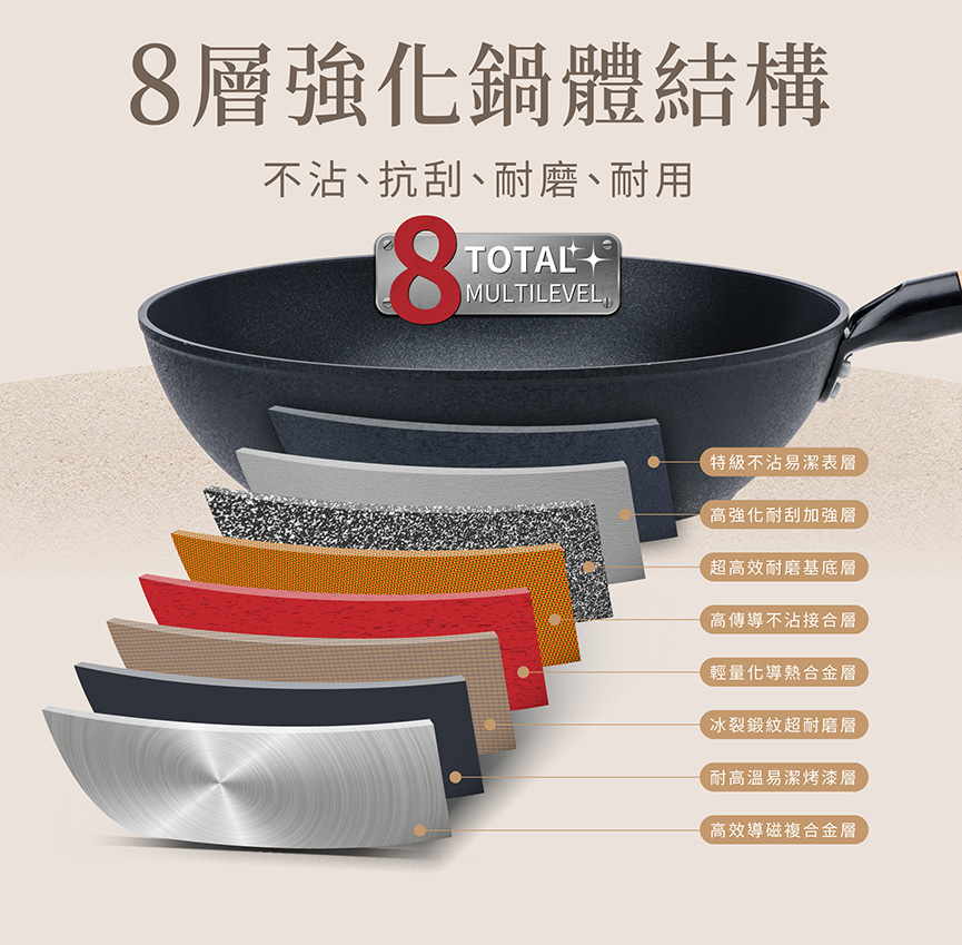 🔸八層強化不沾塗層|極致不沾效果,料理不黏鍋、清洗更省力