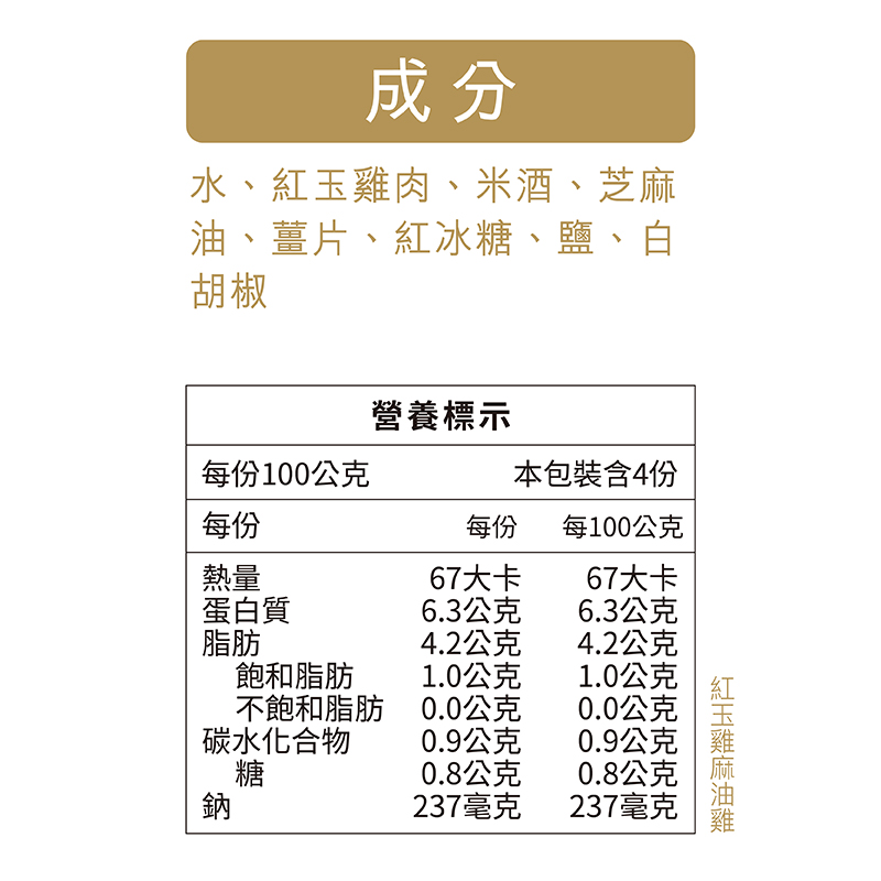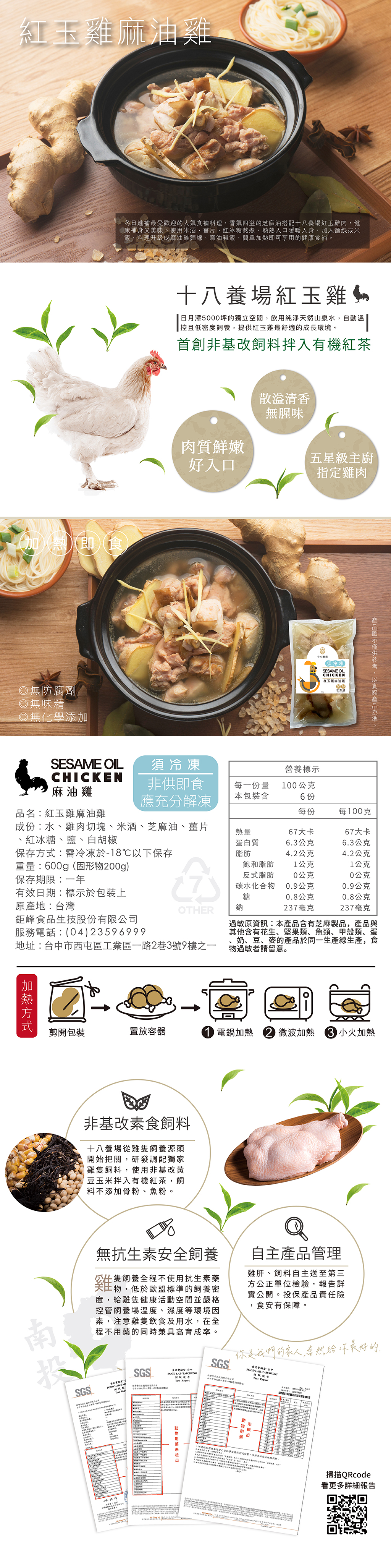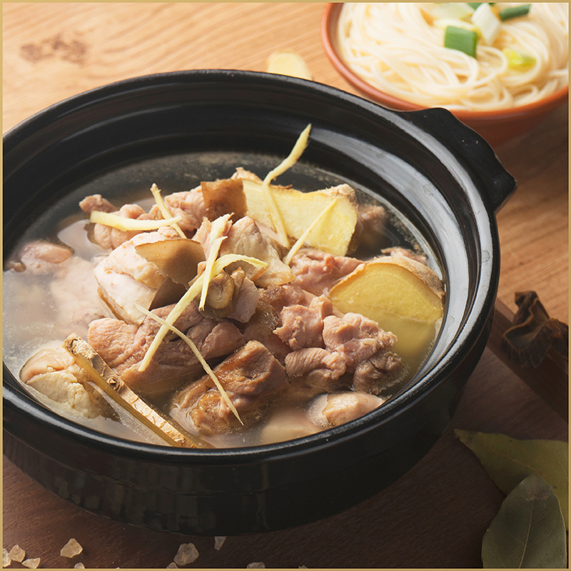 冬日進補最受歡迎的人氣食補料理,香氣四溢的芝麻油搭配十八養場紅玉雞肉,健康補身又美味。使用米酒、薑片、紅冰糖熬煮,熱熱入口暖暖入身,加入麵線或米飯,料理升級成麻油雞麵線、麻油雞飯,簡單加熱即可享用的健康食補。