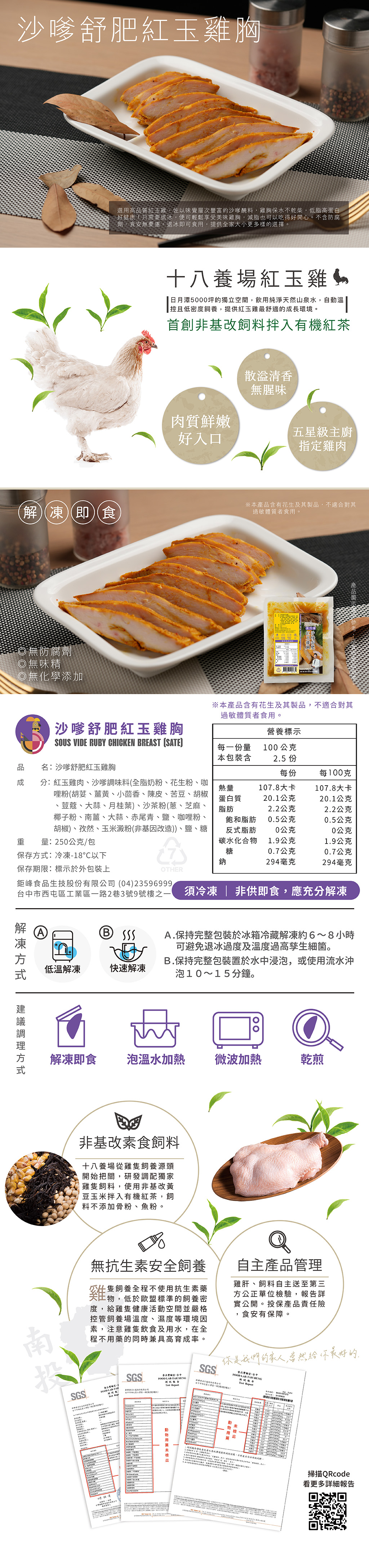 選用高品質紅玉雞,佐以味覺層次豐富的沙嗲醃料,雞胸保水不乾柴,低脂高蛋白好健康!只需要退冰,便可輕鬆享受美味雞胸,減脂也可以吃得好開心。不含防腐劑,食安無憂慮。退冰即可食用,提供全家大小更多樣的選擇。