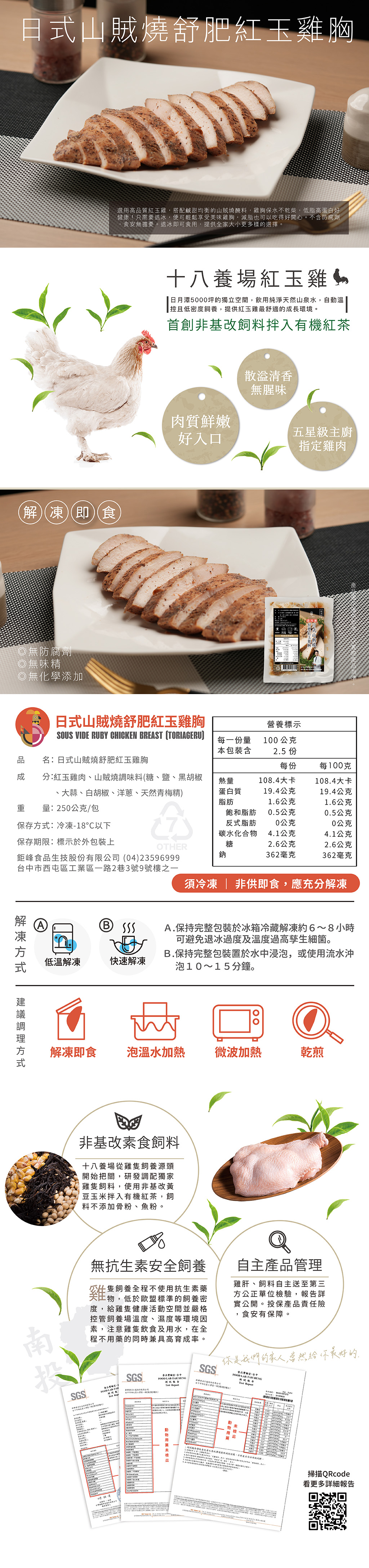選用高品質紅玉雞,搭配鹹甜均衡的山賊燒醃料,雞胸保水不乾柴,低脂高蛋白好健康!只需要退冰,便可輕鬆享受美味雞胸,減脂也可以吃得好開心。不含防腐劑,食安無擔憂。退冰即可食用,提供全家大小更多樣的選擇。