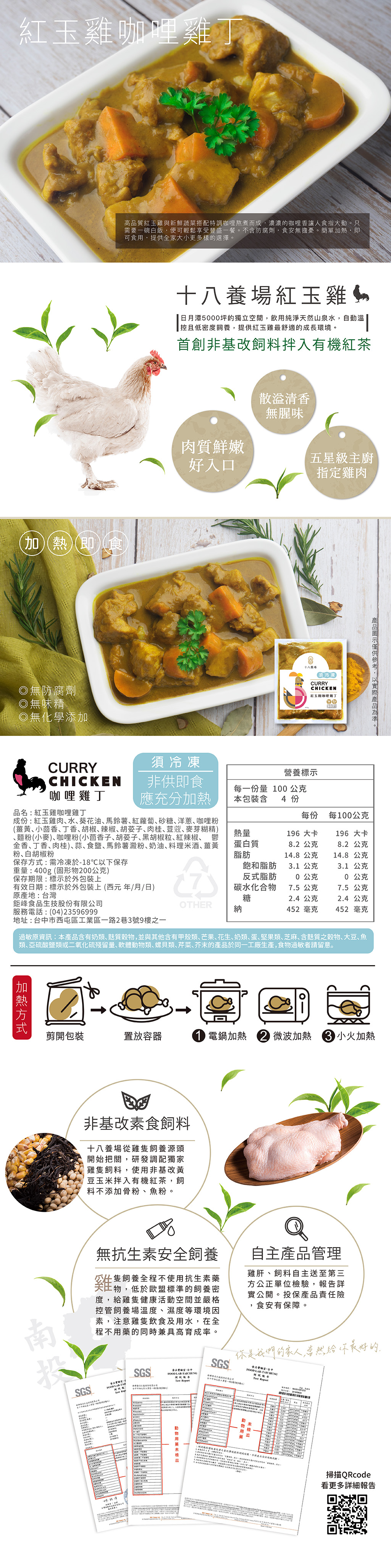 高品質紅玉雞與新鮮蔬菜搭配特調咖哩熬煮而成,濃濃的咖哩香讓人食指大動。只需要一碗白飯,便可輕鬆享受豐盛一餐。不含防腐劑,食安無擔憂。簡單加熱,即可食用,提供全家大小更多樣的選擇。